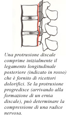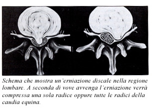 Quando è interessato il tratto lombare o lombo-sacrale si manifesta una lombalgia o più frequentemente una lombo-sciatalgia(cioè dolore che a partenza dai lombi si irradia verso la parte posteriore dell’arto inferiore).